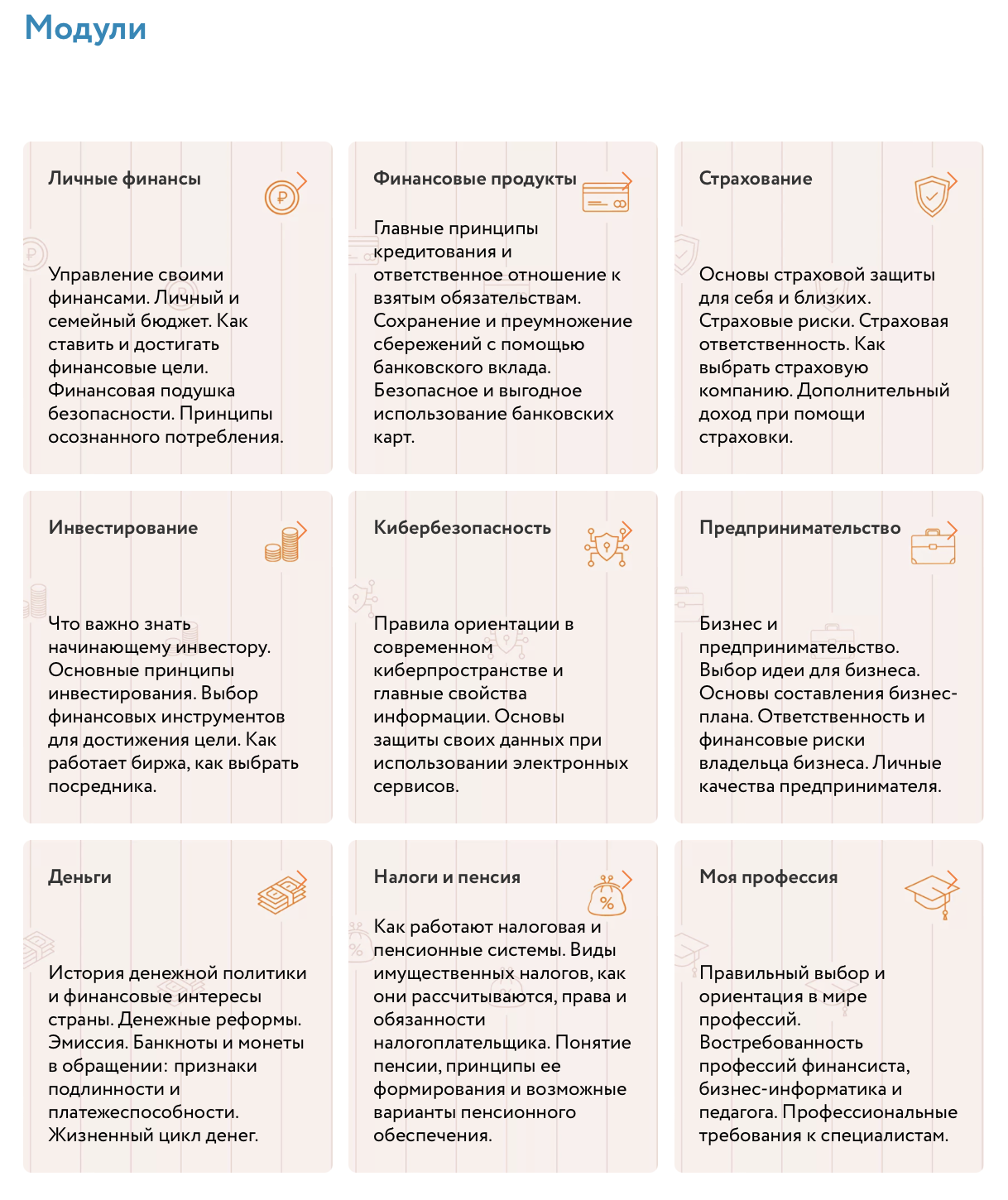 Онлайн-уроки финансовой грамотности проводятся Банком России для учащихся общих и средних образовательных организаций, профессиональных образовательных организаций (ПОО), организаций для детей-сирот и детей, оставшихся без попечения родителей. Эксперты рассказывают учащимся о личном финансовом планировании, инвестировании, страховании, преимуществах использования банковских карт. Особое внимание уделяется правилам безопасности на финансовом рынке и защите прав потребителей финансовых услуг.