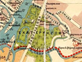 В 1869-1780 годах от реки Екатерингофки до Лиговского канала (ныне Лиговский проспект) был прорыт неширокий канал с оборонительным валом, разделявший Екатерингоф на две части. Таким образом, парковый период развития Екатерингофа закончился, и на смену ему пришел новый период.